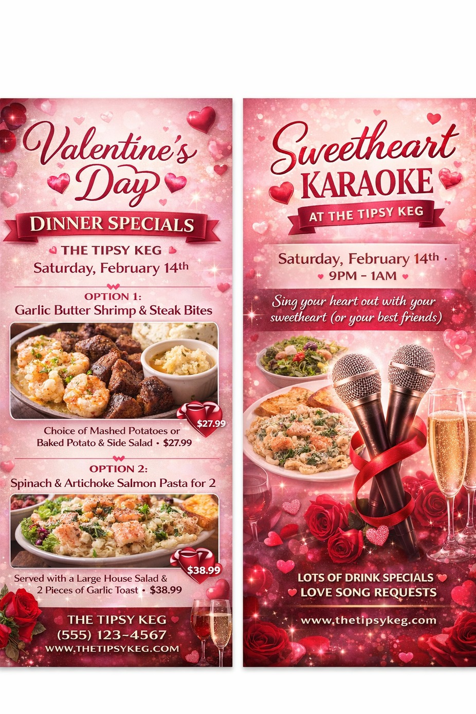 ✨ Dinner Specials ✨ 🥩 Option 1: Garlic Butter Shrimp & Steak Bites Served with your choice of mashed potatoes or baked potato & side salad — $27.99 🐟 Option 2: Spinach & Artichoke Salmon Pasta for Two Includes a large house salad & two pieces of garlic toast — $38.99 📍 The Tipsy Keg 📅 Saturday, February 14th ⏰ Kitchen open 11AM–9PM 🎤 After dinner, stay for Sweetheart Karaoke! 9PM–1AM — Sing your heart out with your sweetheart (or your besties 💋) 💞 Reservations recommended. #ValentinesDay #SweetheartKaraoke #TheTipsyKeg #DinnerForTwo #ValentinesSpecials
