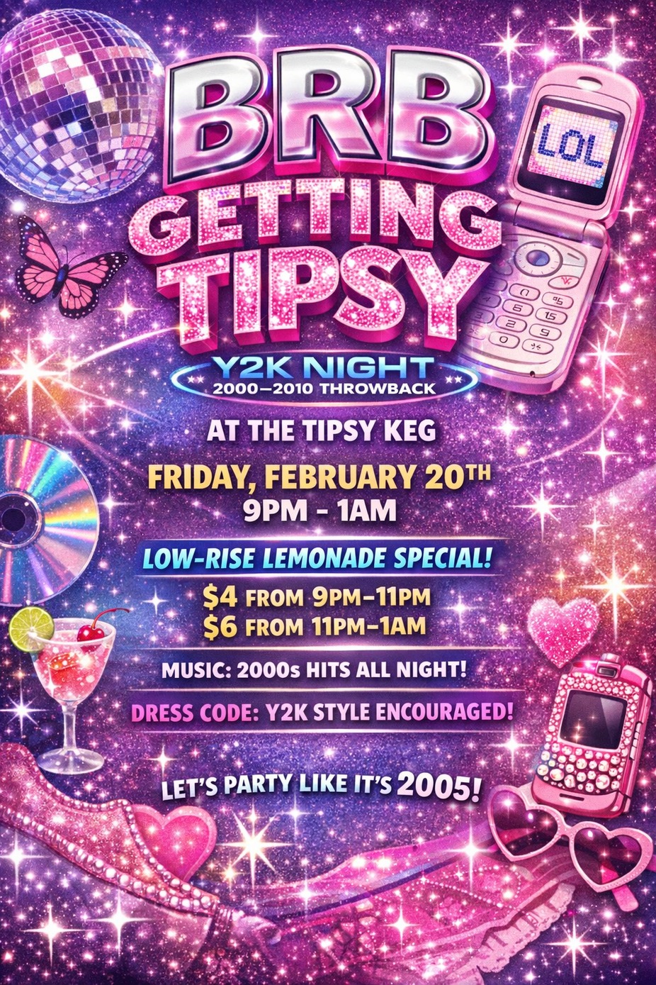 📍 The Tipsy Keg 📅 Friday, February 20th ⏰ 9PM–1AM 🍹 Drink Special: Low-Rise Lemonade • $4 from 9PM–11PM • $6 from 11PM–1AM 🎶 Music: Non-stop hits from 2000–2010 (Britney, Usher, Nelly, Rihanna, Gaga & more) 👖 Dress Code: Y2K fits HIGHLY encouraged (The more rhinestones, the better ✨) Grab your crew, strike a MySpace pose, and let’s get tipsy like it’s 2005 😌 #BRBGettingTipsy #Y2KNight #TheTipsyKeg #ThrowbackParty #LowRiseLemonade